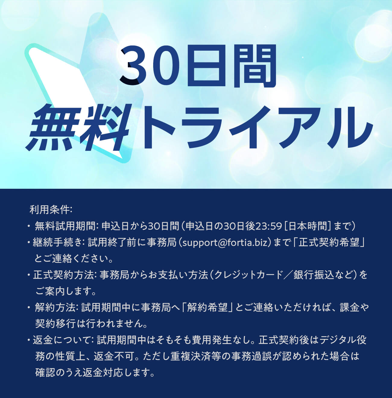 本サービスの無料試用は30日間です。試用終了後に自動で課金・契約移行は行いません。継続してご利用いただく場合は、お客様による有料サブスクリプション申込み手続きが必要です。